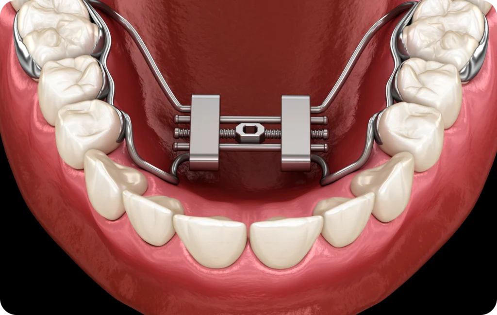 L’appareil d’expansion est fixé sur les dents du haut et parfois en appui sur le palais. Il comporte une vis centrale qui, lorsqu’elle est activée selon un rythme précis, exerce une pression douce et progressive sur les deux parties du maxillaire afin de les écarter légèrement.